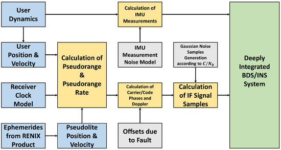 The framework of simulation is shown is Figure 4. The figure mainly describes the generation approach of IF signals and IMU measurements. Moreover, the functions of the framework’s modules and their relationships are illustrated. Noise generation and Fault injection are expressed in gray boxes.