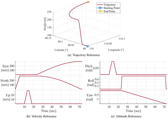 In this simulation, IF signal samples were generated according to the receiver trajectory designed in advance. The starting point coordinate was set as ”” and the altitude was 100 m. The movement states of the receiver included acceleration, uniform moving, climbing, and turning. To reveal the receiver movement more apparently, the receiver trajectory, velocity, and attitude references are plotted in Figure 5a–c, respectively.