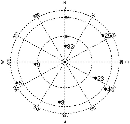 Pseudolite model was applied in this simulation scenario. Actual BDS satellite ephemerides were achieved from International GNSS Service (IGS) products for pseudolite simulation. The broadcast ephemerides were collected on 1 February 2020 from BCEmerge. The BDS satellite orbits and movements were simulated using the ephemerides mentioned above. Through this approach, the position and velocity of BDS satellites could be calculated for IF signal generation. The DI system utilizes the same ephemerides for positioning and integration. We selected seven of the visible BDS satellites in the ephemerides for this simulation. The sky plot of the seven BDS satellites at the starting epoch is shown in Figure 6.