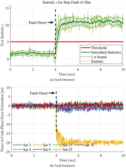 For fault detection, the test statistic defined in Equation (34) is applied. The test statistic s in Figure 8a bumps up and exceeds the threshold at s where the step fault occurs. It reveals that the RAIM algorithm can detect the fault immediately. The mean and 1- bound of the statistic s over time is also plotted in Figure 8a. They are calculated by using a sliding window including 10 statistic samples. The mean and standard deviation values of all sliding windows are plotted with a thicker green line in this figure. On account of the abrupt increase of the statistic, s at s, the 1- bound fluctuates fiercely at the same time.