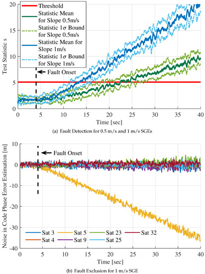 The test results of one sample in each Monte Carlo group are shown in Figure 11. In Figure 11a, the mean and 1- bound of the statistic s over time for both m/s SGE and 1 m/s SGE are presented. The statistics for m/s SGE and 1 m/s SGE exceed the threshold at s and s, respectively. The fault detection time can be computed as s and s. A statistic rate detector algorithm referenced in [19] can be utilized here to reduce detection time and promote the sensitivity of fault detection. It will be researched in future work.