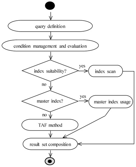 The point of the processing is, therefore, the suitability of the index. If the order of attributes is not suitable, the index is not used. Let’s have a table T consisting of four attributes: A, B, C, D. Let’s have an index I formed by the pair of the attributes A, B. If the query requests values of the attribute C based on the attribute D, it is clear that the particular index cannot be used. Thus, the TAF method is used. The only solution to cover the problem is to create a new index, which has, however, negative aspects in the term of the change management performance. If the system is dynamic with various query construction types over time, the problem is much deeper. The whole table must be scanned sequentially with an emphasis on the data fragmentation. Therefore, performance is getting worse and worse. Deleting old records does not solve the problem, too, whereas the number of blocks allocated for the object is never decremented (HWM cannot be shifted to the left part of the linked list). The point is, therefore, clear—propose the solution to cover the problem by removing the impact of full table scan necessity. Next section deals with our proposed solution.