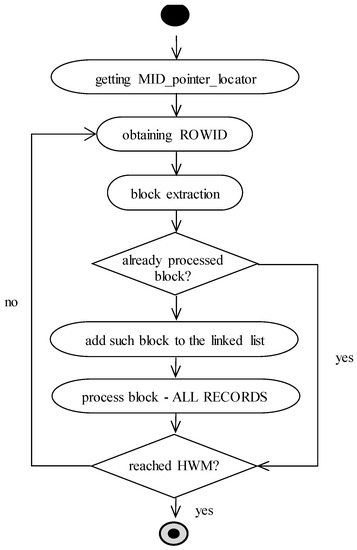 Our proposed approach uses the private global area (PGA) of the server associated with each session separately. In this structure, local variables are stored. In our case, we use it for the list of individual blocks. Multiple rows can be located in the same data block. Therefore, before the evaluation, the address of the block is extracted from the ROWID value, which is consecutively checked, whether such block has already been processed or not. Notice that the whole block is evaluated, not only the row itself. The reason is based on the efficiency of I/O operations. It could happen that block with multiple records is read into the memory. If only one record is evaluated, such a block would have to be processed later for further records. In the meantime, however, the block could be removed from the buffer cache as it is a clean block type, and no changes are made to it. Thus, the number of I/O operations would increase beyond the number of blocks actually used. The diagram expressing the processing steps is shown in Figure 7.