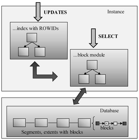 In the previous definition, the principle of using ROWID values to identify blocks is used. As described, management is extended to check whether such a block has already been processed or not. The aim of the solution is clear, to minimize the amount of I/O operations, which is part of the most expensive operations of the systems themselves. As a result, it would be grateful if the solution can use identifiers of the block on the leaf layer instead of the ROWIDs. It is, however, not possible directly, whereas there is no possibility to modify existing index approaches in the core of the database system. The solution is, therefore, based on two interconnected index structures. One of them resides the original and consists of the ROWID values in the leaf layer. The difference is that they do not point to the data blocks in the physical database but are routed to the second index. Pointers are always paired, from the index to the block module and vice versa as well. Thanks to that, any change in the block management can be easily identified, and the whole supervising layer can be notified. Block module form is similar to the index; it uses the B+tree structure too. On the leaf layer, pointers to the physical database are on the block granularity. If any block is freed and is associated without particular data, such blocks are not part of the block module and automatically skipped. The master index method uses only the block module and scans the blocks in a parallel manner. If there is any change in the data, the original index is used, which, however, automatically reflects the change in the block module, if any change in the segment or extend block positions are done. Select statements use direct access to the block module. The architecture of the solution (model 5) is in Figure 8 [24].