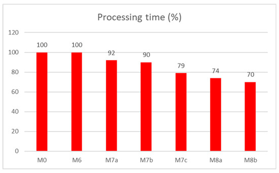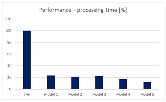 The results are shown in Figure 9, expressed by the processing time in the second precision. Values in the graph express the improvement or slowdowns of the processing time in percentage. The referential model is based on the original method for the data access, if no suitable index is present in the system—TAF method. Based on the results, it is clear that all solutions provide significant improvement. Ten percent of the data is part of the result set, and there is a fragmentation level of 50%. In model 1, the performance requires just 23.5% of the processing in comparison to the reference model TAF. The model 2 performance is even a bit better and requires only 21.3%, whereas irrelevant blocks can be skipped with no transfer and loading process into the memory. Model 3 is based on the data dictionary and provides similar performance results (22.4%). Our proposed solutions expressed in models 4 and 5 are the best. Model 4 is based on the original master index method. In this case, the processing time requires only 17.3%, assuming that the selected index is not already loaded into the memory. If so, the processing time can be reduced by 5.1 percent. The last model (Model 5) provides the best solution in comparison with other models. It adds a new layer for dealing with the data blocks themselves. In this case, the processing time percentage is 12.1%. Notice that in the optimal environment, no fragmentation is present. In that case, individual solutions would reach almost the same results. However, in the real environment, data evolve, are changed, and historical data are removed from the system, whereas they are volatile and do not provide additional information value [27,28]. As a consequence, data blocks are fragmented and can be even free. Based on the results, if the fragmentation is present, the location of the relevant blocks by using the master index brings significant benefit. If the fragmentation is 50%, performance expressed by the processing time can be lowered up to 12.1% in comparison with the TAF method. It is caused by the reduction of the I/O transfer, which is the most demanding operation of the query evaluation.