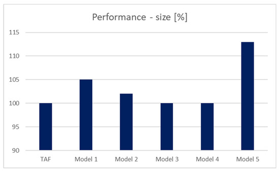 The performance of the system is, however, not just the processing time itself. It is clear that there is a significant benefit to the proposed solutions. On the other hand, it is useful to monitor the total costs in a complex manner, as well. For these purposes, the second part of the evaluation is based on the size of the structure necessary to reach the results. For illustrative purposes, values are expressed in percentage. Model 1 reduces the available size of the block holding the data tuples, whereas it references the next block by storing its fullness. Additional demands are 5%. Model 2 uses only pointers; if the block is totally empty, it is skipped from the evaluation and consecutive processing. It is significantly beneficial if the free blocks are grouped together. Thus, the additional demands are 2%. Data dictionary resources only extend the existing categorization by the definition of totally free blocks (Model 3). It requires less than 1% of the additional demands. Model 4 does not add any new structure; therefore, there are no additional size structure requirements. Model 5 is different. It provides a significant benefit in the processing time aspect; however, a new layer dealing with the block pointers must be added. It consumes an additional 13%. Results in a size manner are shown in Figure 10. The reference model uses the TAF method. Notice that from the relational paradigm itself, each data table should have the primary key definition; thus, one index, which can be denoted as master, should be always present. If several indexes are present, master index technology can provide even better results.
