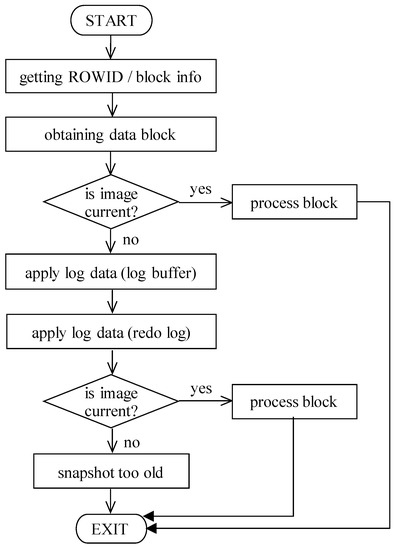 Significant limitation and performance disadvantage of the changes logging is reflected by the select statement. Each data to be updated must be loaded into the memory buffer cache. When executing, changes are reflected in the data block in the memory. Thus, in the physical database storage, the original data block is located, and change is performed on the memory block, regardless of the transaction activity and status. It is clear if the transaction is approved, a particular block contains current valid data. Unfortunately, if the transaction is refused, particular data changes must be rollbacked, as well. Similarly, when querying data, a consistent image must be built [1,2]. For these purposes, log data, either from memory, but from the physical storage, are used. Active transaction log data can never be lost and rewritten, mostly due to transaction rules, consistency, and durability. The process of the block reconstruction can be, however, significantly resource consuming. Figure 11 shows the whole process. In the first phase, “block info” is obtained, followed by access to the block itself. If it is current, it can be directly processed, forming a result set. The more complicated situation occurs if some transactions are applied to it. In that case, log data must be used, aiming at the composition of the current image. Unfortunately, data about the approved transactions can be overwritten; thus, if the active transaction lasted too long, it can happen that the original image cannot be created. As a result, “snapshot too old” exception is raised and produced to the user interface.