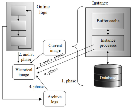 Such a situation is very demanding in the complex query processes, like analytical queries, prognoses making, etc. The problem can be partially solved by using archive log repositories. As shown in Figure 12, log data from the physical storage can be copied to archive repositories before replacing them with new data change vectors. Thanks to that, it is always possible to reconstruct an image, although it can last too much and consume many resources. Figure 12 shows the architecture of the archiving and the process of obtaining the image from the archive log mode. In comparison with Figure 11, it accesses the archive module using the archiver background process, if the appropriate image cannot be constructed from the live active (online) data logs. The negative of the mentioned technique is associated with disk storage demands. The size of the archive log mode repository is still rising. Therefore, it is necessary to cover the physical transactional data management, as well, to ensure the robustness and efficiency of the whole process.