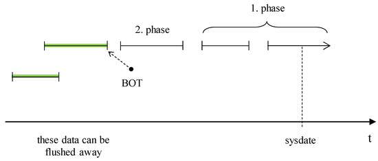 As evident, our proposed solution is based on the data block architecture. Its aim is to access the block with relevant data as soon as possible by skipping inappropriate or free data blocks. It is, however, inefficient just to cover the process of the data location without the reference on the direct data stored in the table with an emphasis on the running transactions. Therefore, we propose our own solution for the transaction layer, as well. Three models are proposed, categorizing the efficiency, performance, and usability of the whole process. The first model (M6) does not change the architecture of the transactional log management in the archive data layer but takes emphasis on the relevance of the archive data. We call it the “suitability identification model”, and its aim is to remove too historical archive data, which are not relevant for the image composition anymore. Any data change vectors applied to the data later than the beginning point of the currently active transaction cannot be removed. Data about the transaction that started before the beginning point but ended after such point cannot be removed, as well. Data characterizing current active transactions cannot be removed from the definition. They are either relevant for obtaining data snapshots, as they were in the past, but are the crucial substance of the transaction definition, too. Figure 13 shows our proposed solution model. Log data are not categorized based on the storage location (memory, redo log in the database, archive repository), but with reference to the time and transaction definition.