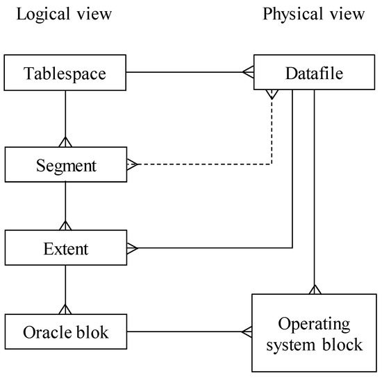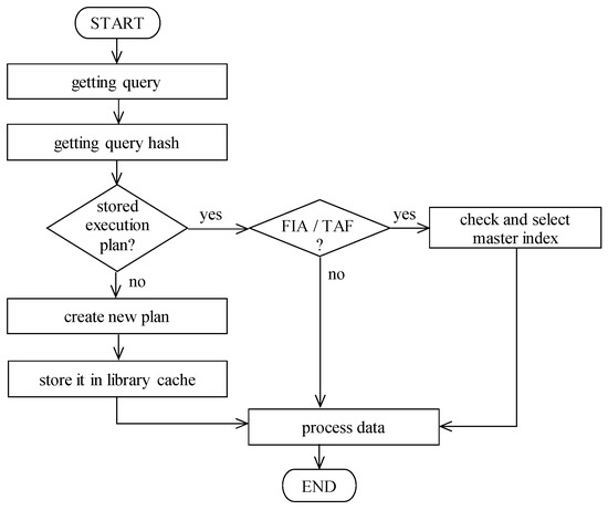 The most important step in terms of processing efficiency, optimization, and access rules is just the execution plan, which determines the usage of indexes. Access methods can be, in principle, divided into two categories—direct access to the data files (table access full (TAF) method) or access by using an index (index scan) or just by their combination. TAF traverses the entire table, all data blocks associated with the table, which can be physically widespread into multiple data files. The word entire table is significant. For each data segment, a high water mark (HWM) symbol is defined as determining the last block for the particular structure, which can be generally empty, whereas new blocks are not associated separately, but as the group forming extents. That means that also blocks with no valid data must be moved into the memory for the evaluation. Even more significant limitation is formed by the fragmentation properties. Block does not need to be completely full; in the real environment, there is significant fragmentation on the block granularity caused by the variability of individual row size, as well as processes of data changes, where the updated row does not fit the originally allocated space [20,21,22]. To ensure efficiency and robust performance, it is necessary to limit the usage of TAF methods.
