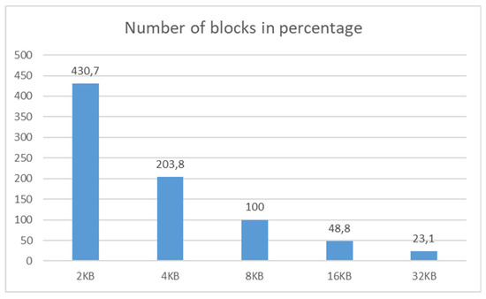 Based on the reached results presented in Table 5, costs vary from 388 up to 400, which expresses the difference as a 3% slowdown. When dealing with a 2 KB data block, data access costs have the lowest value (880). With the increase of the block size, costs are rising due to I/O operation and loading necessity. Namely, the data block is the core granularity; thus, no smaller data portion can be loaded. An important aspect is a ratio between the row size and the total block capacity. A 4 KB block brings a 5.9% increase in costs. A similar increase is identified (5.5%) in the transfer from 4 KB to 8 KB. A 6.3% processing cost increase is defined when shifting the granularity from the 8 KB to 16 KB. To conclude the evaluation of the processing costs, it is clear that doubling the block size brings about a 5%–6% increase in costs caused by the loading process and ratio between the block and row size. Processing costs increase vary from 1 up to 3 s, which reflects a 1 up to 4% increase.