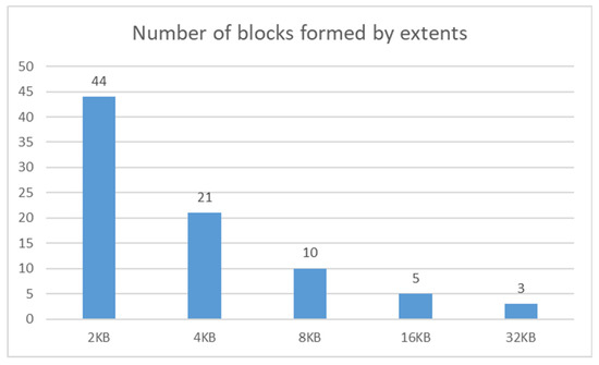 The characteristics are nearly linear. If the basic block size is larger, then, naturally, fewer blocks are necessary to be assigned by the system. The 2 KB block size structure requires 430.7% of blocks, in comparison with the referential model (8 KB). Vice versa, 32 KB block structure requires only 23.1%, but the capacity is quadrupled. Thus, after the transformation to the default environment settings (8 KB), the system saves approximately 7.6% of the block count capacity. Blocks are, however, not allocated separately but are formed as the set to the extent. The principle of the results expressed in Figure 16 is based on the assumption that the block and extent itself is the same expressed by the 1:1 mapping. One extent is in that case bounded by just one block, which is not, however, appropriate from the performance point of view, in case of changing data, inserting new rows, or updating existing tuples. The allocation process namely is resource consuming and requires server components coordination and their usage. Therefore, blocks are not created separately but by using extents. Their size and allocation principles are based on the configuration of the tablespace. In our case, the uniform size is used. Correlation between block and extent capacity can be found in [1,2,3]. Figure 18 shows the number of extents calibrated to the default block size, 8 KB, expressing 100%.