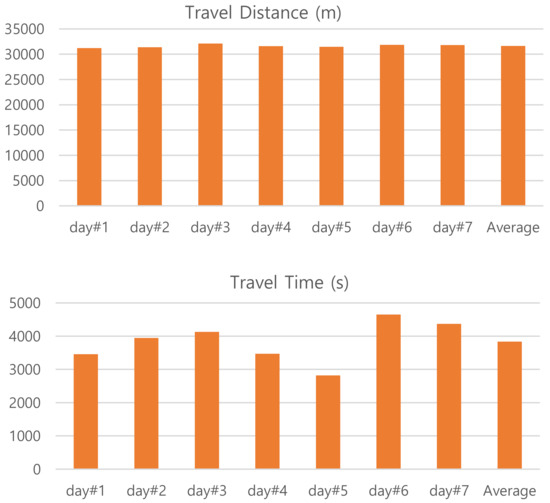 We collect user’s spatial mobility data using a GPS logger, which is built around the MediaTek’s MTK3339 chipset [21]. It can track up to 22 satellites on 66 channels in a −165 dBm sensitivity with a 15 × 15 × 2.5 mm built-in ceramic patch antenna. The GPS logger is configured to generate NMEA sentences at fop = 1 Hz such that user’s movements are sampled at every second. A single user’s commute history by a personal automobile is traced for seven different days. Figure 3 provides a summary of each trajectory data with respect to travel distance and time. Since all the trip pass through the same route there are little differences in travel distance. One-way trip consists of around 31.6 km on average (between 31.2 and 32.1 km). Any variation in the value comes from the way of measurements, in which it accumulates point-by-point from its trajectory data. However, there are noticeable differences in elapsed time depending on traffic conditions. The travel time is 3835 s on average: The trajectory data of day#5 takes the least time (2822 s) and that of day#6 takes the most (4649 s) to travel the same commute path.