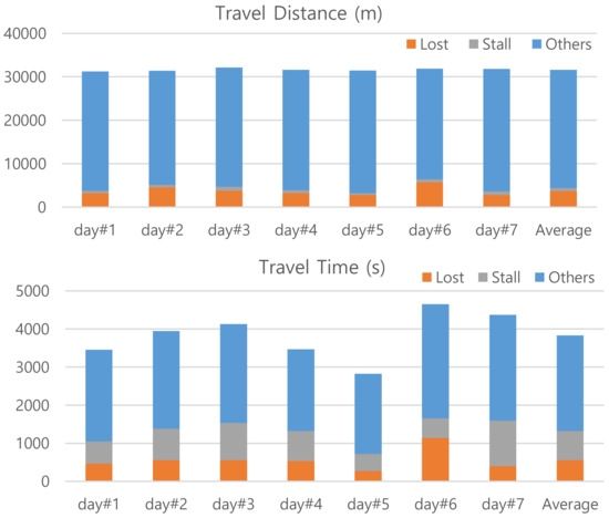 The context, which one might want to know in lifelog applications, of the trajectory are clearly the route and elapsed time for the trip. In addition, information on places of significance and time delay around the area within the route would be desirable. The FFTS is an effort to simplify a trajectory data without losing this context. In this experimental study, we set window size K = 6 so that we can simplify trajectory data with only the last 5 s history. The parameters of (TfixL, TfixF, DmaxS, TmovS, SminG, TmovG, ΘminT) are set to (4 s, 2 s, 1 m, 3 s, Sslow = 15 km/h, 3 s, 30º). The corresponding thresholds of (nL, nF, mS, mG) for counting become (5, 3, 3, 4) considering the GPS logger’s sampling frequency of fop = 1 Hz. Moreover, we set B = 3 to divide SwinK into two sub-windows of SwinKf and SwinKb. These values are determined empirically. Using feature points of FFTS we can redraw Figure 3 for more context of the trajectory. Figure 4 provides the same summary on travel distance and time by feature types. While the travel distance for STALL, which is ideally zero, is marginally constant the travel time for STALL varies much day-by-day. We expect the same for LOST. From the graph, however, we can see that the travel distance and time for LOST of day#6 are significantly larger than others.