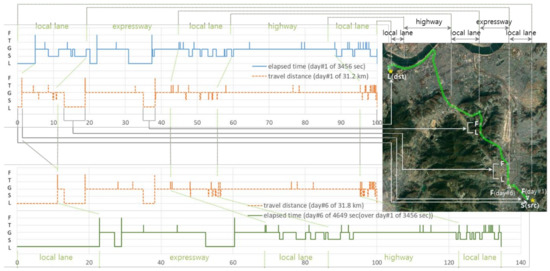 In order to inspect further the trajectory data of day #6 we visualize its context with normalized travel distance and time. For comparison, the trajectory data of day#1 is drawn together. There are four graphs in Figure 5. The upper two are about the trajectory of day#1. The y-axis represents the type of feature points of F, T, G, S, L. The x-axis represents scale in % with respect to travel time of 3456 s for the top most line graph or scale in % with respect to travel distance of 31.2 km for the second dotted line graph. The lower two graphs are the same context but about day#6, which we want to examine. Note that the x-axis of the bottom most line graph is normalized to travel time of 3456 s of day #1 instead of 4649 s, which becomes 134.5 %, of day #6 for direct comparison between them. Figure 5 also provides the trajectory data on Google map for convenience. The commute path begins at the bottom-right point of yellow star labeled by “S (src)” and ends at the top-left point labeled by “L (dst)”. In between several dots, which represent different feature types, are shown so that we can match the graphs with the path on the map.