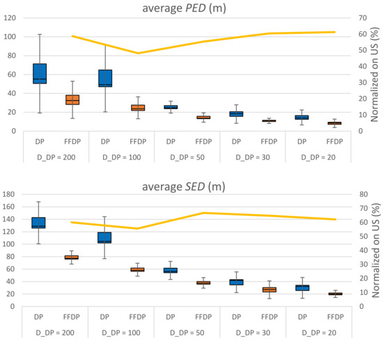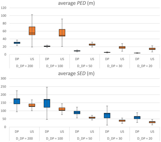 Figure 7 shows the performance comparison of the original DP and US algorithms by varying the threshold DDP = 200, 100, 50, 30, 20 m. For the graph we use average PED or average SED such that they can be independent of the travel time for the same commute path. The performance data of each trajectory is provided on Table A1 and Table A2 in Appendix A. For a fair comparison we set the parameter TUS of US by the parameter DDP of DP such that the compression rates of them are comparable. We cannot make them exactly the same because DP is an error-bounded simplification scheme while US is a size-bounded one. The compression rate of each trajectory is provided on Table A3 in Appendix A. From the graph we can see that DP significantly outperforms US, as we expected, with respect to PED. However, surprisingly it is not true with respect to SED: US is better than DP. In many literatures SED is a prefer metric to PED since it counts on both spatial and temporal aspects of a trajectory. It seems to result from several causes. First, the DP implementation in this study relies on perpendicular distance when it adds a data point to the simplified trajectory P′. In SED calculations, however, it assumes that the object moves at constant speed between two consecutive sampled data points. For instance, Figure 8 shows five data points of trajectory P. Let us say that pi and pj are two sampled data points of a simplified trajectory P′. The three discarded data points of pk1, pk2, pk3 lie unevenly on the original trajectory and their corresponding virtual data points of p’k1, p’k2, p’k3 lie evenly on the simplified trajectory. In this scenario, SED = a’ + b’ + c’ is clearly larger than PED = a + b + c. Second, errors in trajectory simplifications tend to be enlarged as the number of missing points between two sampled data points increases. That is, in Figure 8, if there were a single discarded data point of pk2, instead of three, then PED = b << a + b + c and SED = b’ << a’ + b’ + c’. At the same compression rate, the number of missing points between two consecutive sampled data points varies largely in DP while it is constant in US. That is, in US the SED of each segment can be bounded within a certain range. However, in DP the SED of a segment can be amplified. Note that this case study is executed in real situations, which generate highly redundant trajectory data of which compression rates are easily higher than 95+%. There are many chances to amplify the SED in the simplification.