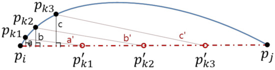 In order to quantitatively compare the effectiveness of FFTS we use perpendicular Euclidean distance (PED) and synchronized Euclidean distance (SED) metrics [7,10,13]. Suppose that pi and pj are two consecutive data points of a simplified trajectory P′: pi ∈ P′ and pj ∈ P′. We can consider a data point pk, which is discarded in the P′, of the original trajectory P between pi and pj: but . PED measures the shortest distance between pk and the line segment . In contrast, SED finds a virtual data point p’k on the line segment via interpolation. Then, it measures the distance between pk and p’k. The total error is the sum of those distances for each data point of the original trajectory P.