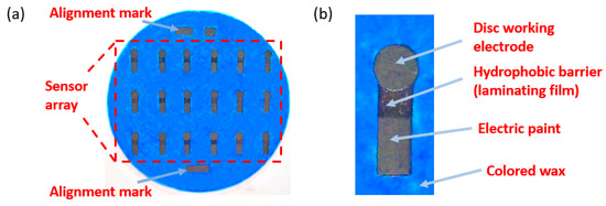 Pictures of a wax-printed electrochemical paper-based sensor: (a) Optical image of working electrode array on a 90 mm diameter filter paper; (b) disc working electrode (4 mm diameter) which is surrounded by colored wax and a hydrophobic barrier on top [67].