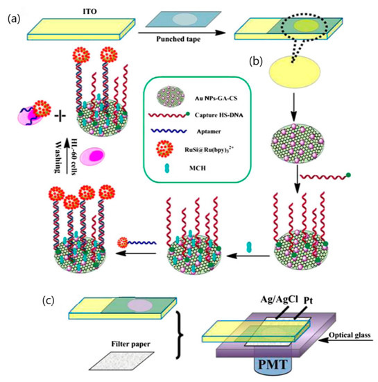 Xu and co-workers had reported the fabrication of a disposable paper-based ECL biosensor for the detection of human leukemia (HL-60) cells as shown in Figure 8. This ECL biosensor is developed using an aptamer-based approach and utilized porous filter paper as an electrochemical cell connected to a sheet of indium-tin oxide WE modified with gold nanoparticles and graphene [90]. The aptamer of HL-60 cancer cells is tagged with [Ru(bpy)3]2+-conjugated silica nanoparticles. This detection limit for this fabricated disposable testing platform could go down to 56 cells per milliliter [90]. A compilation of various electrochemical-based detection techniques used and their respective criteria along with the results obtained was tabulated and illustrated in Table 3.