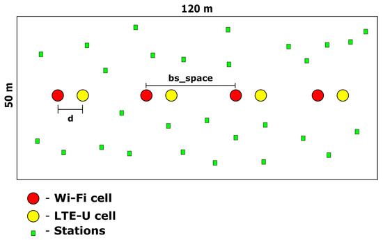 To better evaluate the coexistence problem between Wi-Fi and LTE-U, 3GPP proposed evaluation scenarios in the technical report TR36889 [7]. Among the proposed scenarios, the indoor (Hotspot) scenario is the most challenging and complex since it comprises not only multiple users but also interference between the same and different access technologies. Figure 3 presents the 3GPP indoor scenario considered in this work. This scenario is composed of two operators, called operator A and operator B, in an unlicensed band deploying four small cells each. The deployment is on a building room with dimensions of 50 × 120 m, no walls, and with the four base stations of each operator equally spaced in the X-axis defined by the d and distances. Besides the four cells, forty stations are randomly distributed in this rectangular region with no mobility [7].