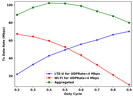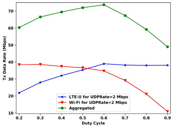 Figure 5 is the similar to Figure 4, but now with Mbps. For this offered data rate, the maximum aggregated transmitted data rate is reached for a DC value of 0.4., indicating that the system, for this situation, reaches its maximum with Wi-Fi having more channel access time than LTE-U. Furthermore, for this UDPRate, the transmitted data rate for each operator is more affected by the DC value. While for Mbps, and duty cycle values bigger than 0.6, the LTE-U’s transmitted rate slightly changes, now for Mbps, the data rates keep increasing with the DC value, and the Wi-Fi ones keep decreasing.