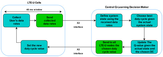Figure 7 shows a flowchart of the proposed solution. From a macro-perspective, the proposed algorithm has two main steps. The first one, at the LTE-U cells, updates the actual DC value and reports the reward (data rates) to the central Q-Learning node. The second step, at the central Q-Learning node, performs a Q-Learning cycle, yielding in a new DC. This new DC value is reported back to the LTE-U cells in which the step one is started again.