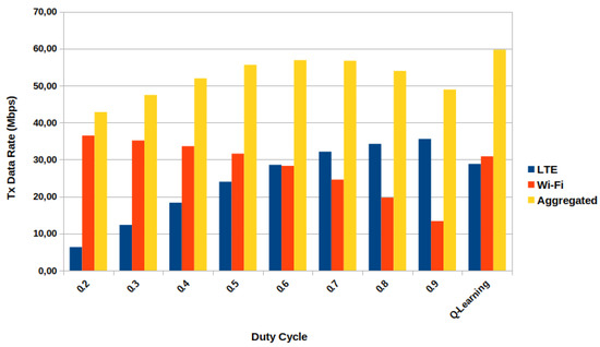 Figure 8 presents a bar graph of the simulation results using some fixed DC values and with our proposed framework. With the proposed framework, the maximum aggregated transmitted data rate is increased when compared with all the duty cycle values without the solution. When compared with the best static results, , and , the Q-Learning increases the maximum aggregated with around 3 Mbps more than the static ones, corresponding to a 5% increase percentage. If we compare the lower UDPRate versus the Q-Learning gain, it can correspond to six times increasing (UDRate with 500 kbps). If we focus on each operator, the LTE-U and Wi-Fi transmitted data rates present gains over the ones for . However, if we take the other best static DC value, 0.7, only the Wi-Fi presents gain over the static case, even though the system still reaches its maximum. Furthermore, neither the LTE-U data rate with Q-Learning does not reach the maximum it can achieve , nor the Wi-Fi at . Still, the goal was set to maximize the aggregated . The algorithm chose the best combination of duty cycle values for each state the system had passed to reach the goal, which led to a combination of data rates for each operator that was not the maximum possible, but the necessary to the goal as it would be expected.