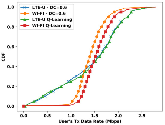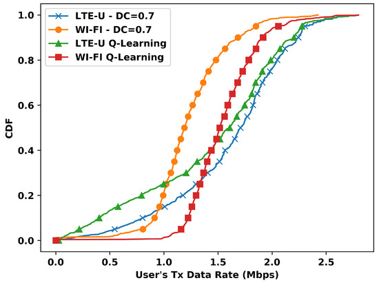 For the duty cycle value of 0.7, the CDF presents a different behavior, as shown in Figure 10. The Wi-Fi stations present even more gains with Q-Learning, despite the gain is comes with the cost of worse performance for the LTE-U stations. With Q-Learning, the 60th-percentile shows that when compared with the case of , the Wi-Fi gains affect the LTE-U stations with fewer data rates. Furthermore, the gain of 3 Mbps presented at the system level, as opposed to the case, is still distributed for practically all Wi-Fi stations. Still, the LTE-U stations with fewer data rates are severely affected.