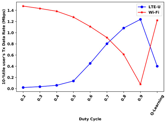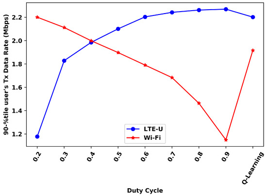 For the 10th-percentile, the Wi-Fi Q-Learning results are better than all duty cycles values higher than 0.5, while the LTE-U ones are better for the duty cycles values lower than 0.5. For the 90th percentile, the Wi-Fi results with the proposed solution are better than all DC values higher than 0.4, while the LTE-U results are better for the duty cycle values lower than 0.5. Still, in the 90th-percentile analysis, it can be seen that LTE-U values do not show much variation for high values of the duty cycle. These duty cycles does not significantly affect this percentile for LTE-U, but only the Wi-Fi.