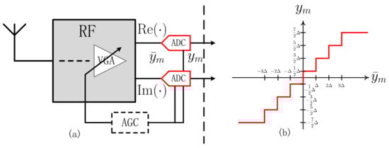 As illustrated in Figure 1, on the receiver side, a variable gain amplifier (VGA) with an automatic gain control (AGC) is used before quantization to ensure that analog baseband samples are within a proper range, for example, . In the sequel, the received signal is down-converted into analog baseband samples and then discretized using a complex-valued quantizer , yielding the quantized received samples