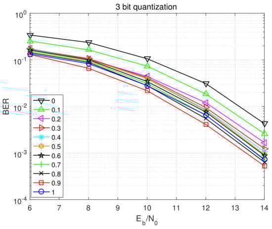 where the few-bit quantizer applies component-wise and we assume in our numerical experiments that b-bit uniform mid-rise quantization [] is separately applied to the real and imaginary parts. In particular, the m-th entry in can be represented as