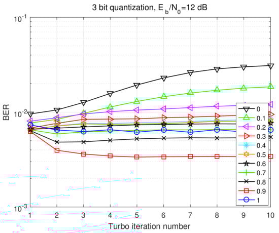 We first evaluate the bit error rate (BER) performances versus at 10-th Turbo iteration for different values of doping factor as depicted in Figure 4. Interestingly, trace shows the best performance, and its BER achieves about 2.1 dB better than that of the worst case , which implies the great influence of on receiver performance. Compared to the PBiGAMP receiver [] (the trace), can also beat it by about 0.4 dB performance gain. We further show the BER performance versus Turbo iteration number at dB for different values of doping factor in Figure 5. Here we see that significantly outperforms other traces. We also see that the BERs will get even worse with the increasing of Turbo iteration when choosing small that is, 0–. It is well known that Turbo principle implies to pass extrinsic information to SISO decoder. Here we introduce the doping factor to mix extrinsic information and posterior information, yielding better performance. In the mmWave systems with few-bit ADCs, there are deviations between the quantized receiving signals and unquantized receiving signals. Under this circumstance, introducing additional noise with certain level can sometimes improve the performance, which is referred as “stochastic resonance” phenomenon [,]. Here in our quantized SC system, we can regard the doping of posterior information as additional noise to dither the “pure extrinsic” information. In another words, the doping of posterior information can compensate the deviation from few-bit quantization. We use the doping factor to control the level of this additional noise. Through Figure 4 and Figure 5, it can be seen that small level of additional noise () can help improve the performance.