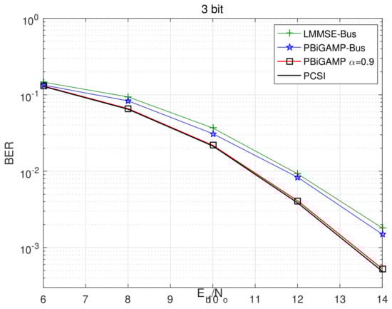 Based on above linear model Equation (51), we have two benchmark methods. One is to perform PBiGAMP directly in this linear model (denotes as “PBiGAMP-Bus”). Compared to the proposed scheme, changes manifest only in lines (L6)–(L7) of Box 1. The other is to perform pilot-aided channel estimation firstly. Treating the above channel estimate as the true channel, we then apply the well-known linear MMSE (LMMSE) equalizer (denoted as “LMMSE-Bus”) (Since the standard LMMSE equalizer requires matrix inverse, which incurs a complexity of per block of symbols, we adopt the unit-variance approximated version of standard LMMSE equalizer [], whose per-symbol complexity is using FFT..) We denote our proposed algorithm as “PBiGAMP ” in the later simulation, and show the performance of the proposed scheme with PCSI (denoted as “PCSI”) as a reference.