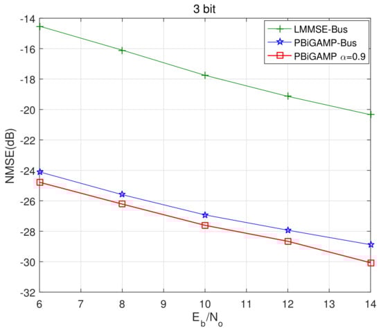 We then pick up the best trace , and compare it with PBiGAMP-Bus and LMMSE-Bus in Figure 6 and Figure 7. The BER performance is shown in Figure 6, where we can see that the BER of PBiGAMP is nearly indistinguishable from the PCSI bound, and outperforms about 1.1 dB and 1.3 dB better than that of PBiGAMP-Bus and LMMSE-Bus, respectively. The normalized mean square error (NMSE) of channel estimation is shown in Figure 7, where the NMSE of PBiGMAMP achieves about 2 dB and 10 dB better than that of PBiGAMP-Bus and LMMSE-Bus, respectively.