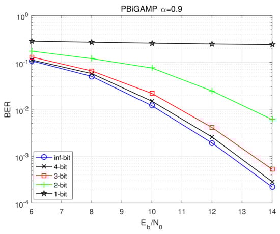 For the proposed PBiGAMP receiver, we further show the BER performances versus at 10-th Turbo iteration under different quantization precisions in Figure 8 where “inf-bit” denotes no quantization. As we can see, the BERs get worse with the decrease of quantization precision. Compared to inf-bit case, the BERs of 4-bit and 3-bit degrade only about 0.2 dB and 0.8 dB, respectively; the BER of 2-bit case gets about 3.3 dB worse; and the BER of 1-bit case does not work well, which suggests to adopt stronger encoding or lower-order modulation (i.e., BPSK).