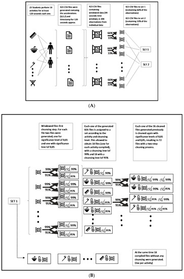For each of the 423 files the MD was calculated, and data cleaning performed as a first step. This cleansing process was carried out considering a significance level of 0.05 and 0.01 with the chi square test. Once this cleansing was performed the data were compiled considering the activity. This yielded 18 files for training purposes cleaned with a significance level of 0.01 and 18 with a significance level of 0.05. Similarly, with the test data, 18 with a significance level of 0.01 and 18 files with a significance level of 0.05.