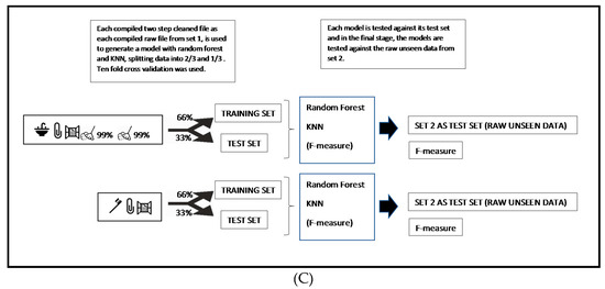 - Phase 8: Create the model (KNN or random forest). The model was created using a 10-fold cross validation with a two-thirds training and one-third testing purposes. All steps were performed with set 1. F-measure values were extracted for each model. Considering that the data were cleaned with different levels in step 1 (Phase 2) and step 2 (Phase 4), four models were created for KNN and four for RF.Phase 8A: A similar way to the described in Phase 8 was followed with the raw data. In this case, a model with KNN and a model with RF were generated.