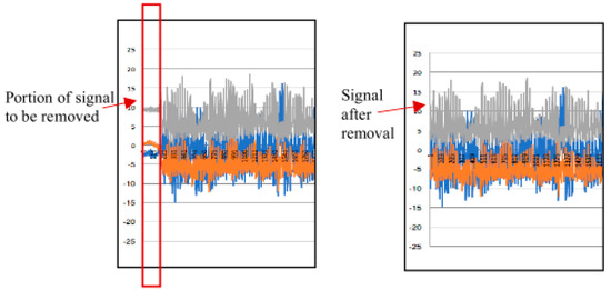 Signal manual cleansing. The values in the y-axis correspond to acceleration in m/s2. The x-axis shows the evolution of the observations. Each second, 51.2 acceleration data are gathered by the shimmer. This means the value of 100 in x-axis correspond to the time 1.95 s. The blue, orange, and grey lines represent the acceleration in x-, y- and z-axis.