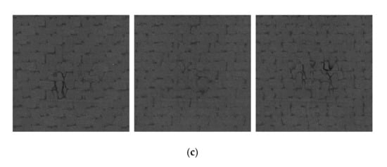The next step was to perform NDT using three methods and acquire the resulting data containing information about the detected damage to be processed in the next steps of this study. Namely, the specimens were scanned using a pulse-echo UT method in the C-Scan mode (see an exemplary result in Figure 2a) and a phased-array UT method in the B-Scan mode (Figure 2b), as well as the X-ray CT method (Figure 2c). The applied technical parameters of these inspection methods were described in [33].