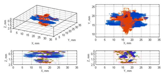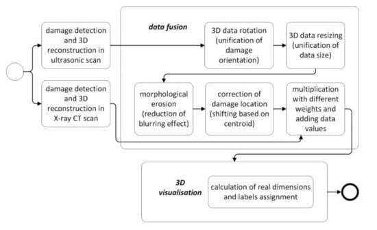 The developed fusion algorithm steps are as follow. Firstly, the raw data acquired during NDT of the composite specimens, namely the ultrasonic C-Scans, B-Scans and X-ray CT scans (as the reference data), were individually processed in order to detect the BVID areas and obtain their reconstructed 3D binary images. For this purpose, previously developed methods by the authors, described in detail in [33], were applied. It should be highlighted that the methods of processing of each type of the NDT data are different and, in the above cited paper, several approaches were proposed. For this study, the authors applied the method of processing: the X-ray CT scans based on the texture-based image segmentation; the C-Scans based on the MBP-based image segmentation and 3D reconstruction; and B-Scans based on the histogram-based image segmentation that enables an automatic detection of the binarization threshold value. The algorithms of X-ray CT scans as well as B-Scans processing were additionally improved by masking the data by the area around a contour of the biggest object detected in a planar view of the 3D image (the view of impact damage), which allowed for a removal of noise around the damage.