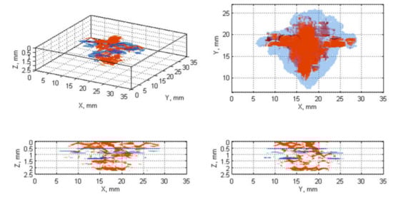 Views of fused damage detected in the X-ray CT scans (red color) and the ultrasonic B-Scan (blue color) for the case E17.5.