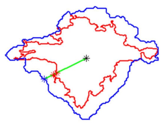 In order to evaluate the damage estimation accuracy based on ultrasonic testing results with respect to the tomographic ones, a measure based on distances between damage boundaries was elaborated. Namely, for each point of a boundary of BVID (extracted from its planar view) detected in a C-Scan/B-Scan, a distance is measured to the point of damage boundary extracted from an X-ray CT scan with the assumption that both points belong to the same curve also passing through the damage centroid. If there is more than one point of the X-ray CT boundary crossing this curve, the outermost one is considered. The example is presented in Figure 6, where red colors are for boundary and points of the X-ray CT, blue colors for the C-Scan, and black point represents the centroid location. Moreover, the sign of the distance value is determined, which returns a quantitative data about damage underestimation or overestimation based on the UT results. Such an approach returns more objective results than in the case of calculating this distance just to the nearest point, since, here, the distances are calculated in all the clockwise directions.