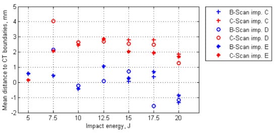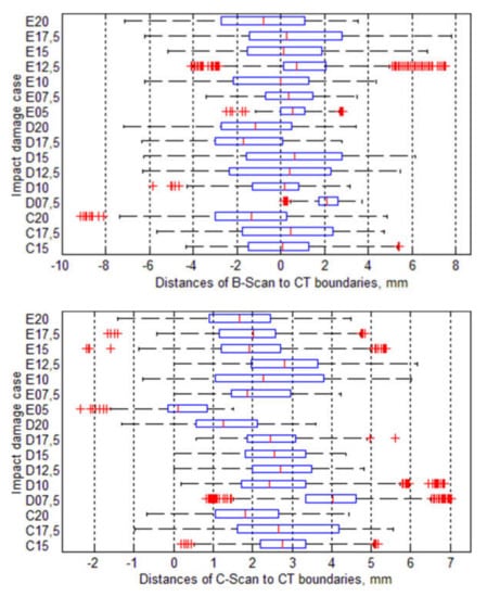 Mean values of the calculated distances for all the considered cases are presented graphically in Figure 7. The initial analysis of these results could indicate that B-Scans bring more exact information about damage since the mean distances are around 0 mm (the exact average for all the damage cases is 0.05 mm), whereas for C-Scans they are mostly around 2−3 mm. However, when analyzed other statistics of the distances’ values (see Figure 8), it can be noticed that the range of distances’ values for B-Scans is much wider (between −10 mm and +8 mm) than for C-Scans (where it is between −2 mm and +7 mm). This means that although the damage extent detected in C-Scans is mostly overestimated (on average by 2.27 mm), the shape of damage is regularly close to the real one (i.e. extracted based on X-ray CT). This stays in contrast to B-Scans, where damage contours are either overestimated or underestimated, i.e., the shape is irregularly different from the real one. These relations can be also observed in the images of damage views, as in the exemplary case presented in Figure 4 and Figure 5 (see especially the planar X-Y views).