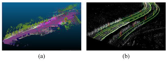 Different types of High Definition (HD) map—(a) point cloud map with semantic labels; (b) vector HD map of a typical urban road.