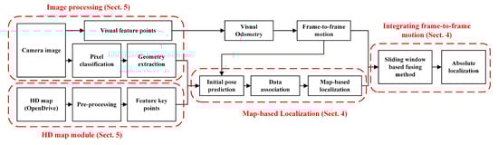 Figure 2 illustrates the system overview of the MLVHM. The HD map module is responsible for map data pre-processing and feature control point extraction for the MLVHM localization model from an HD map in OpenDrive format. In order to achieve high accuracy during map data acquisition, LiDAR is deployed in the real vehicle experiments solely for map acquisition; nowhere throughout the experiment was LiDAR used for vehicle localization. Moreover, the only limitation imposed on the experiment setup is the map data format. As long as the acquired maps conform to the requirement, the maps collected by other sensors are also compatible with our localization method.