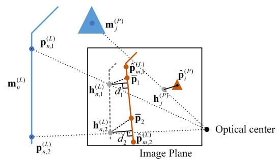 where is the intrinsic matrix of the camera, is the rotation matrix from the world coordinate system to the camera based on the camera orientation. Subsequently, in the Line measurement , the measurement model is expressed as: