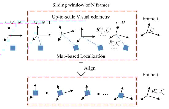 The frame-to-frame alignment can be achieved by determining and . Considering the time-consuming nature of image semantic segmentation, the results of map localization generally differ from the current frame time, thus we assume that there is a delay of M frames. Firstly, a sliding window of N frames is built from to , where is the latest frame from map-based localization. For the localization framework formed by our semantic segmentation algorithm, M is usually 6–8. Then, the constraints of each frame in the frame-to-frame motion and map-based localization is calculated within the sliding window, from which the optimization problem can be solved: