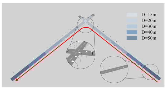Overall, the map-based localization part algorithm sees a performance improvement in both translation and orientation with an increased number of lamp poles and shortened D. As clearly illustrated in Figure 10a,b, the longitudinal and lateral localization accuracy can respectively reach cm and cm when more than two lamp poles are present in the scene, or D is close to 30 m. Some abnormal data points show a slight increase in localization errors when the number of features increases or D decreases. This unexpected behavior is well within the error tolerance and only emerged when the localization performance is approaching its maximum, where further increases in feature formation constraints yield only marginal performance improvements.
