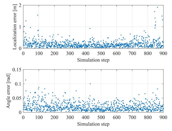 With the two-lane simulation setup, the vehicle localization accuracy is measured in horizontal and angular errors under different lamp pole counts and their respective distances from the vehicle, as shown in Figure 10a–c.