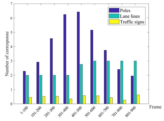 In order to validate the algorithm, a possible correspondence set is randomly generated, and the line features with the same semantics are randomly matched within the set. Three line correspondences (which is the minimal set of correspondences to calculate the camera pose) are randomly sampled and plugged into the Equation (14) for determining the camera position and pose, from which the landmarks in the map can be projected into the camera. If the distance between the landmark and the feature identified in the camera is less than the set threshold, it is considered as an inlier. In addition, the drift from the estimated pose to the initial guess is calculated. If the respective drift satisfies the conditions outlined in step 6 in Algorithm 1, the hypothesized correlation is added to the association hypothesis . D is the distance threshold of the localization drift between the localization result and initial pose prediction, which is set according to the confidence of the initial guess of the camera pose. The initial pose the first frame is from the low-cost GNSS, and the subsequent ones are predicted based on the positioning result of the previous frame and the Visual Odometry. In our test, D for the first frame is set to 6 m, while those for the subsequent frames are set to 1 m. The line 10 in Algorithm 1 shows how to find the best association from a bunch of association groups. Our approach is to calculate the number of association pairs in each group, that is, the size of the inliers, and find the one with the largest number of inliers as the final association.